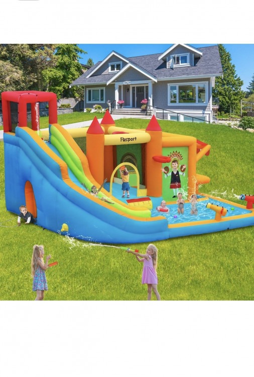 Modular Castle Water Slide Combo48ft Jungle Run Obstacle Course (Wet/dry):Modular Castle Water Slide Combo102090779_2497795_17557510000 Dive into adventure with the Modular Castle Water Slide Combo. Castle like features catching the eye, inviting both kids and the young-at-heart to explores into a great escape. This isn't just any bounce house it's a combo unit combing regular bouncy house and a waterslide. Perfect for sunny days, users can leap into the air, ascend the castle's steps. Then race down the slide, all while staying cool in the splash zone.